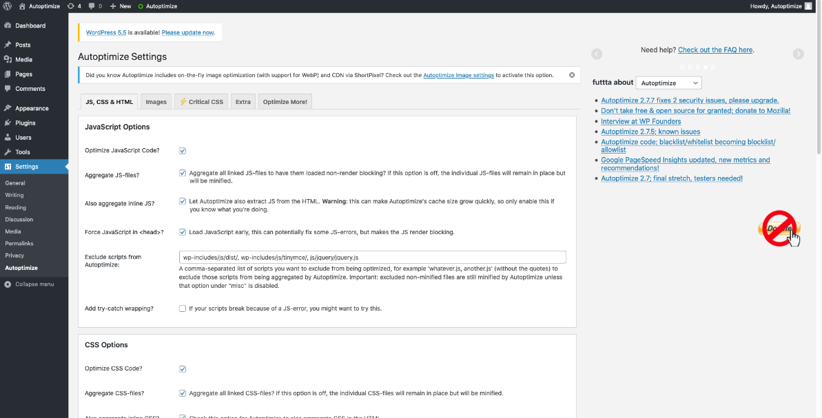 With more than one million active installations, Autoptimize is one of the best and longest-running plugins for minifying JS and CSS files. Once you have downloaded and installed the plugin, go to the Settings menu to configure it. Select all three JavaScript, CSS, and HTML options to minify all these files.
